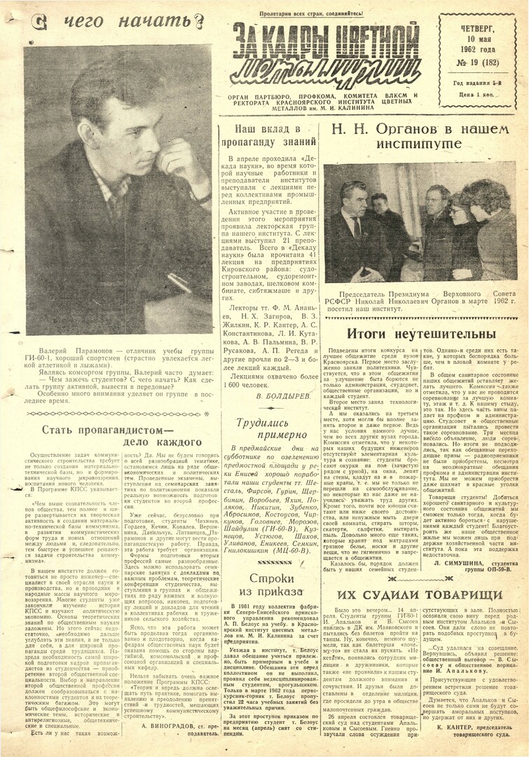 - Н. Н. Органов в нашем институте : [на снимке: Председатель Президиума Верховного Совета РСФСР Николай Николаевич Органов в институте]. — С. 1.
