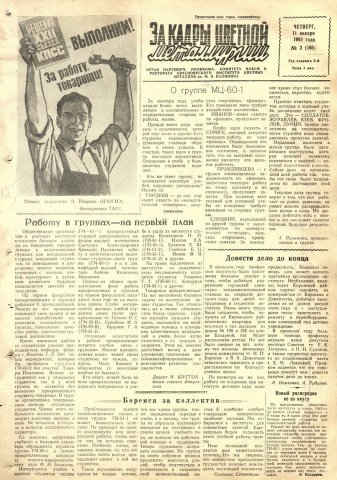 За кадры цветной металлургии : газета. 1962 г. № 2 (165) (11 января)выпуск журнала/газеты