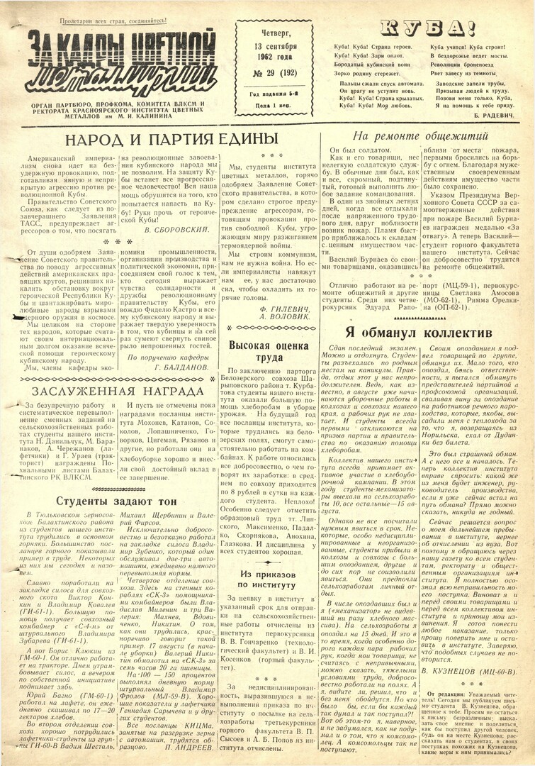 - Народ и партия едины : [одобрение Заявления Советского правительства по поводу агрессии Америки против Кубы студентами и преподавателями института]. — С. 1.В. В. Сборовский, Г. Балданов, Ф. Гилевич, А. Воловик