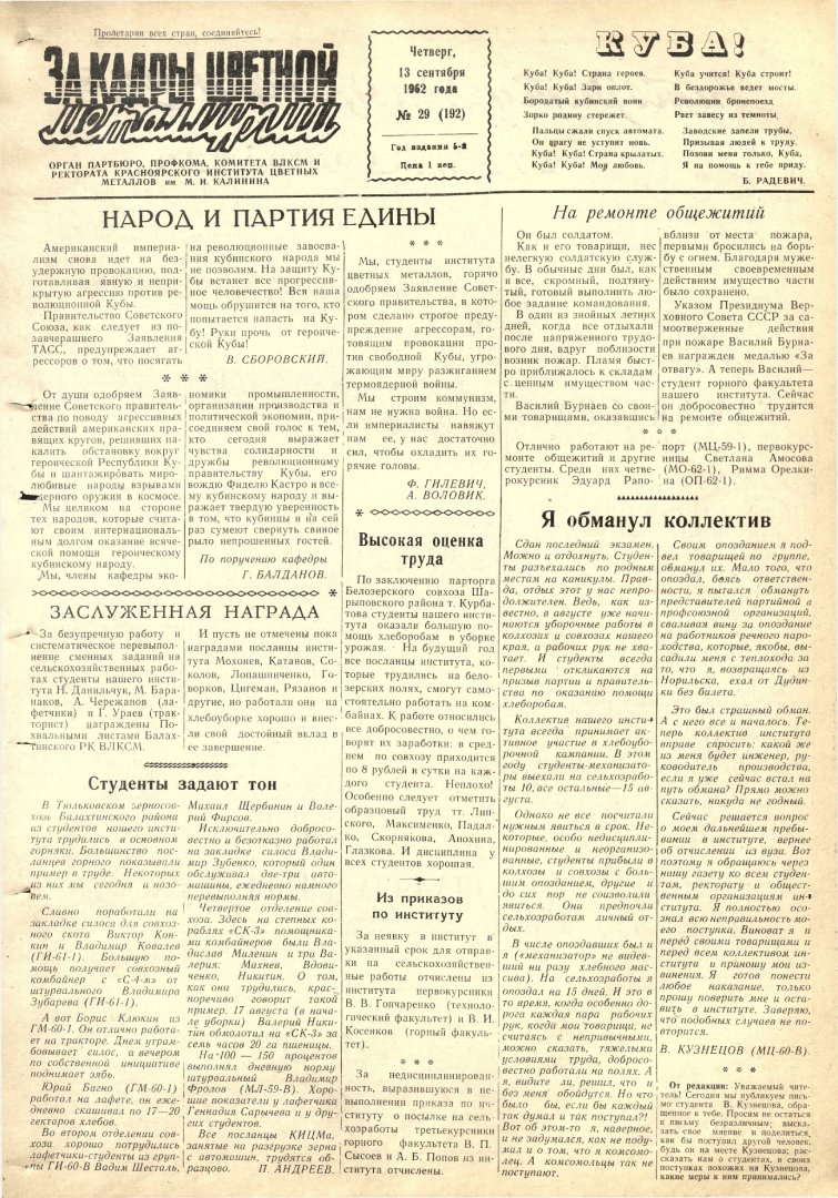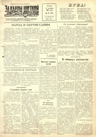 За кадры цветной металлургии : газета. 1962 г. № 29 (192) (13 сентября)выпуск журнала/газеты