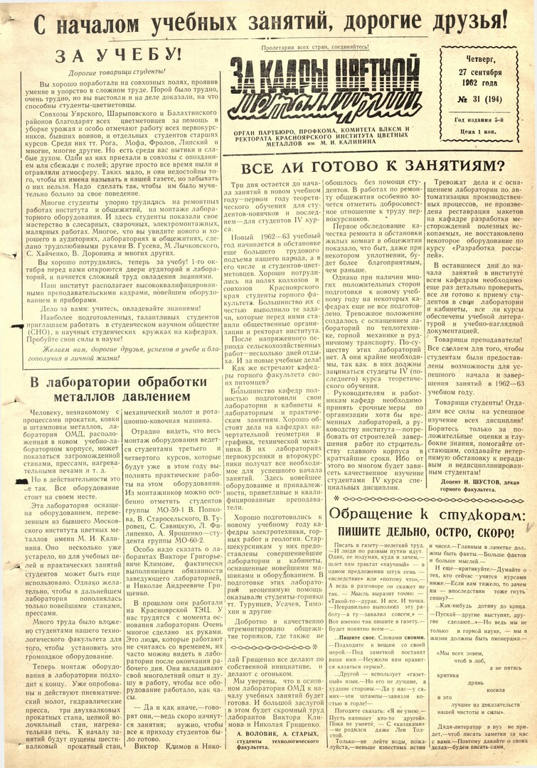 - Обращение к студкорам: пишите дельно, остро, скоро! : [от редакции газеты]. — С. 1.