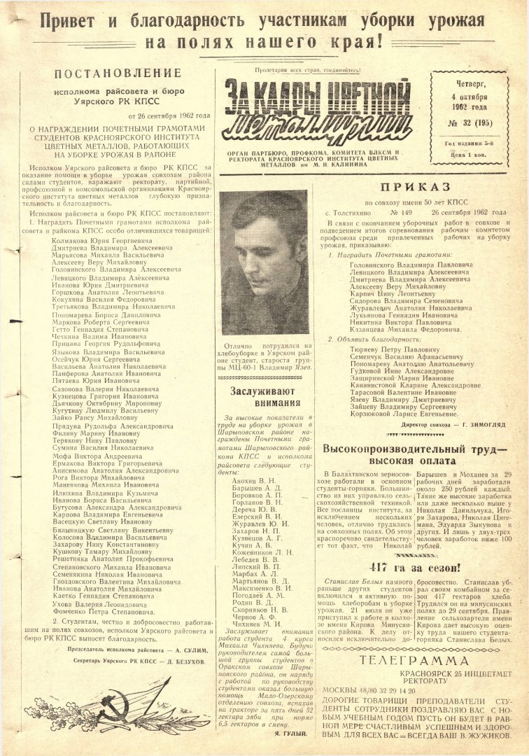 - Постановление исполкома райсовета и бюро Уярского РК КПСС (от 26.09.1962) : [наградить Почетными грамотами; список студентов]. — С. 1.