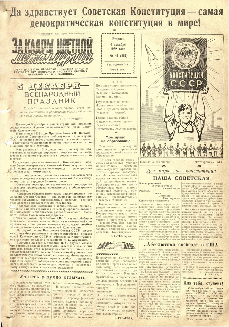 - 5 декабря - всенародный праздник : [День Советской Конституции]. — С. 1.