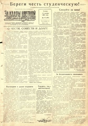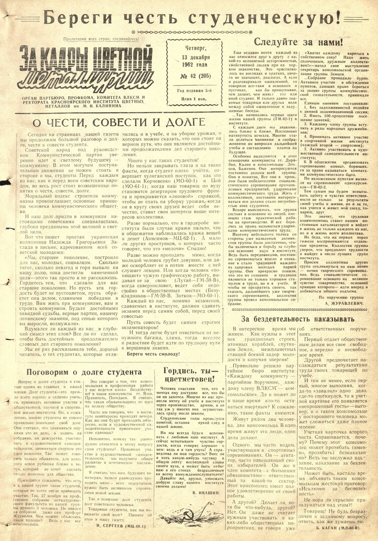 За кадры цветной металлургии : газета. 1962 г. № 42 (205) (13 декабря)выпуск журнала/газеты