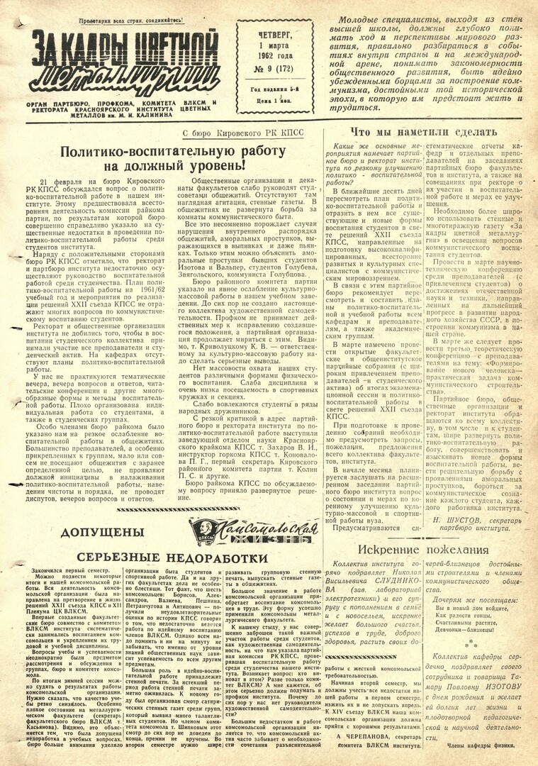 - Допущены серьёзные недоработки : [о работе комсомольской организации института]. — С. 1.