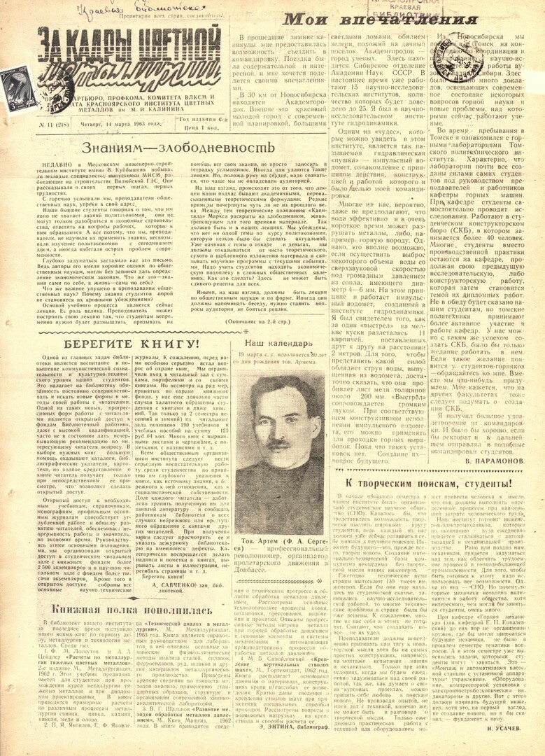 За кадры цветной металлургии : газета. 1963 г. № 11 (218) (14 марта)выпуск журнала/газеты