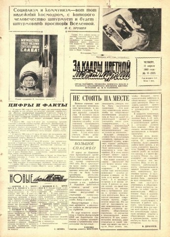 За кадры цветной металлургии : газета. 1963 г. № 15 (222) (11 апреля)выпуск журнала/газеты
