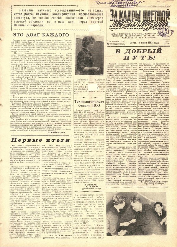 За кадры цветной металлургии : газета. 1963 г. № 22/23 (229-230) (5 июня)выпуск журнала/газеты