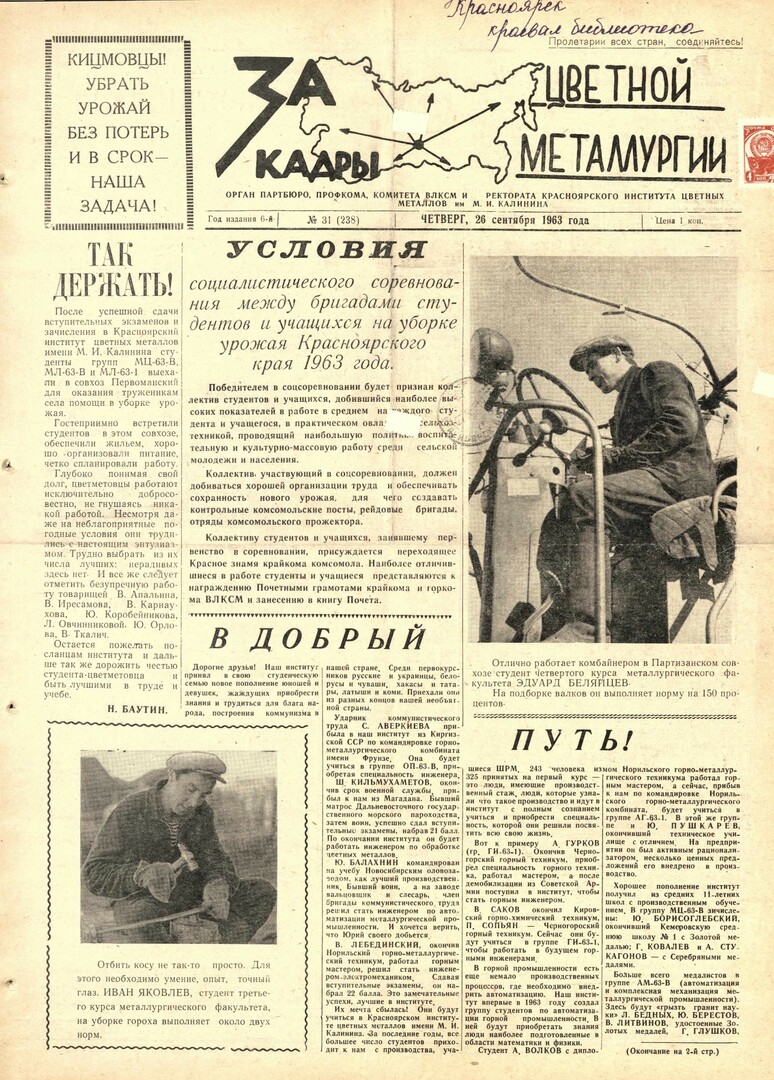 - Условия социалистического соревнования между бригадами студентов и учащихся на уборке урожая Красноярского края. — С. 1.