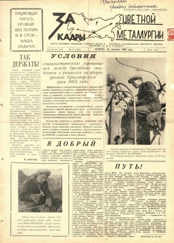 За кадры цветной металлургии : газета. 1963 г. № 31 (238) (26 сентября)выпуск журнала/газеты