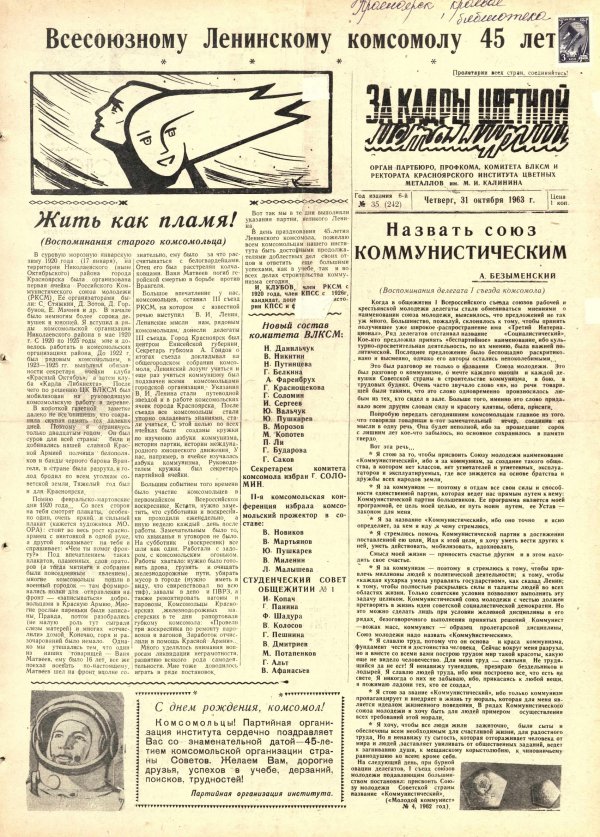 - Новый состав комитета ВЛКСМ : [список]. — С. 1.