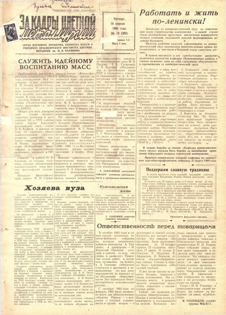 - Хозяева вуза : [о комсомольской жизни Томского политехнического института]. — С. 1.
