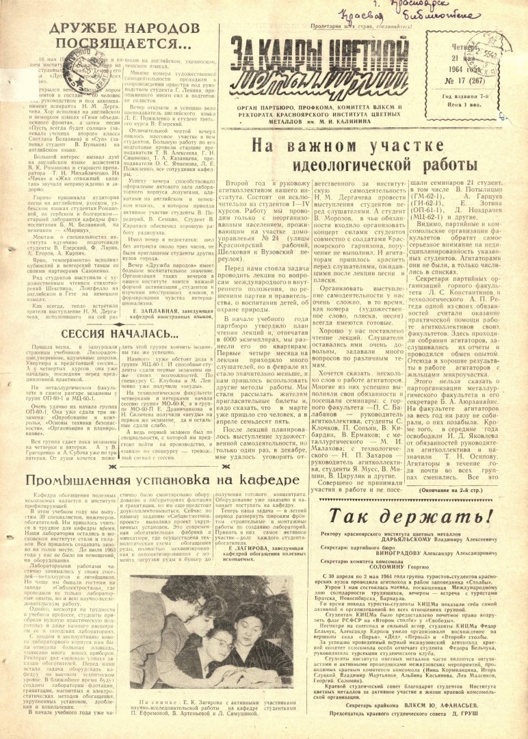 За кадры цветной металлургии : газета. 1964 г. № 17 (267) (21 мая)выпуск журнала/газеты