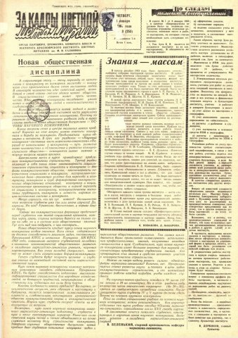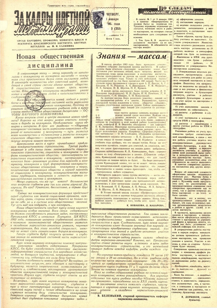 За кадры цветной металлургии : газета. 1964 г. № 3 (253) (23 января)выпуск журнала/газеты