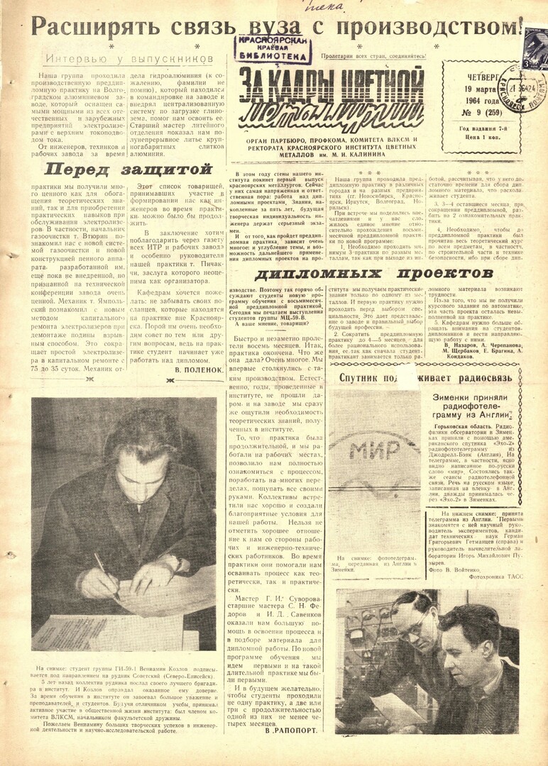 За кадры цветной металлургии : газета. 1964 г. № 9 (259) (19 марта)выпуск журнала/газеты