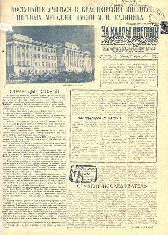 За кадры цветной металлургии : газета. 1965 г. № 10/11 (304-305) (27 марта)выпуск журнала/газеты