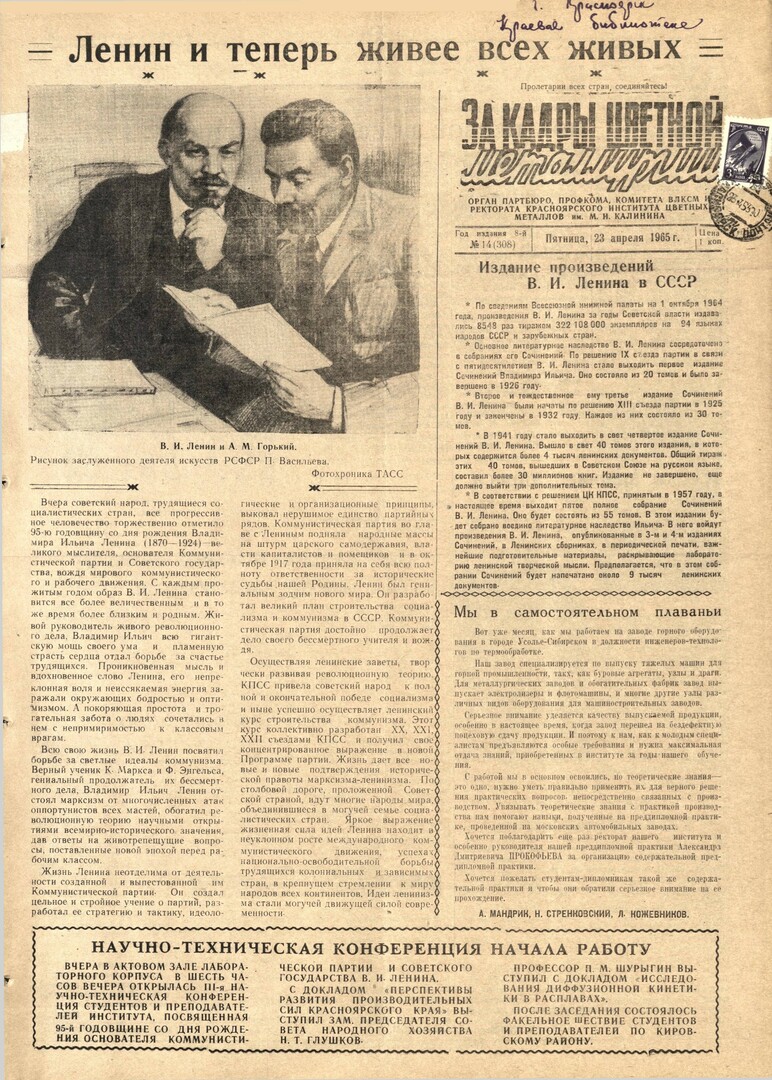 За кадры цветной металлургии : газета. 1965 г. № 14 (308) (23 апреля)выпуск журнала/газеты