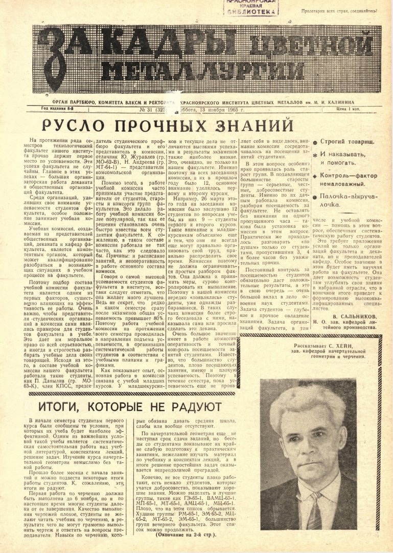 За кадры цветной металлургии : газета. 1965 г. № 31 (325) (13 ноября)выпуск журнала/газеты