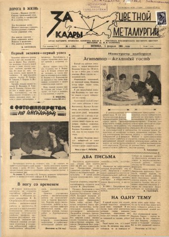 За кадры цветной металлургии : газета. 1965 г. № 5 (299) (5 февраля)выпуск журнала/газеты