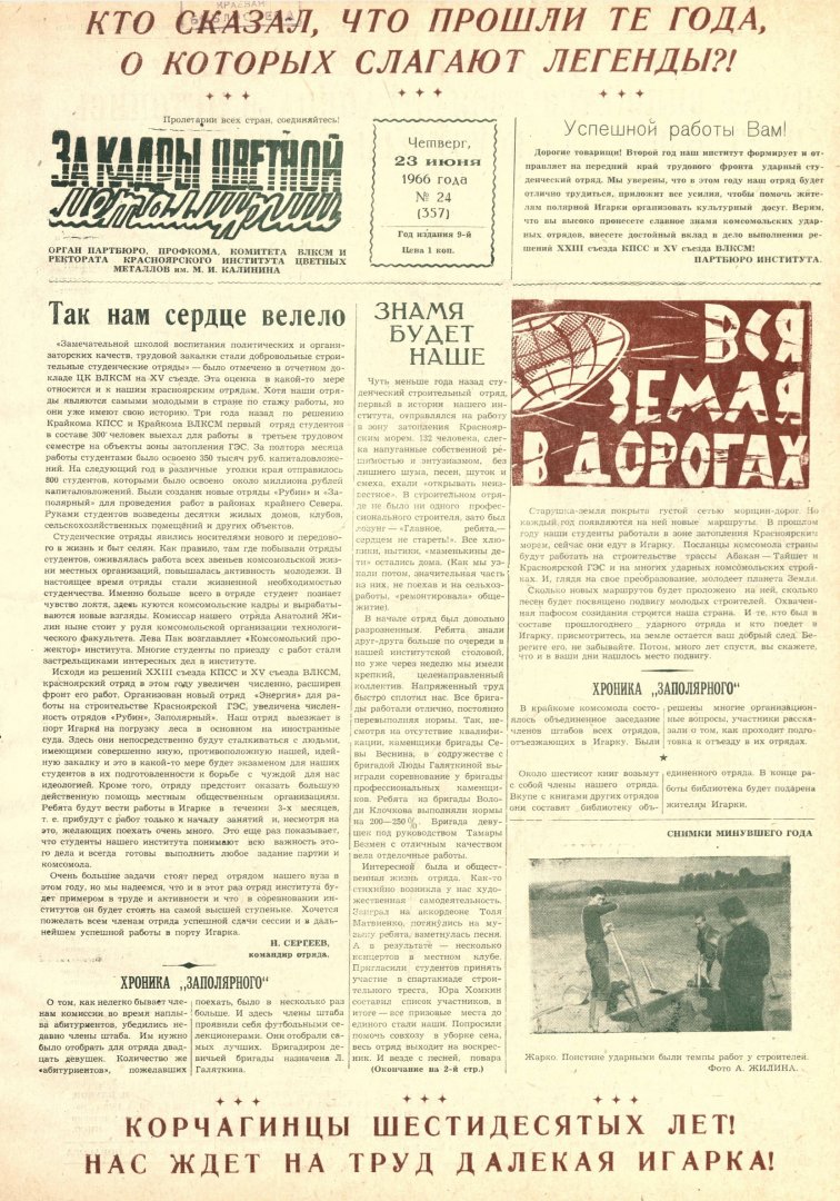 - Успешной работы Вам! : [пожелание успеха в работе в Игарке студенческому отряду от партбюро института]. — С. 1.