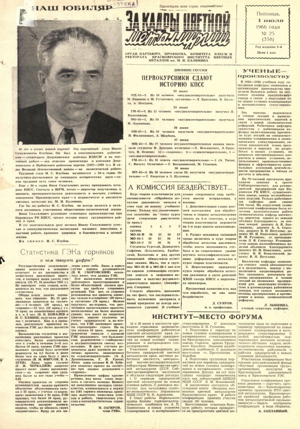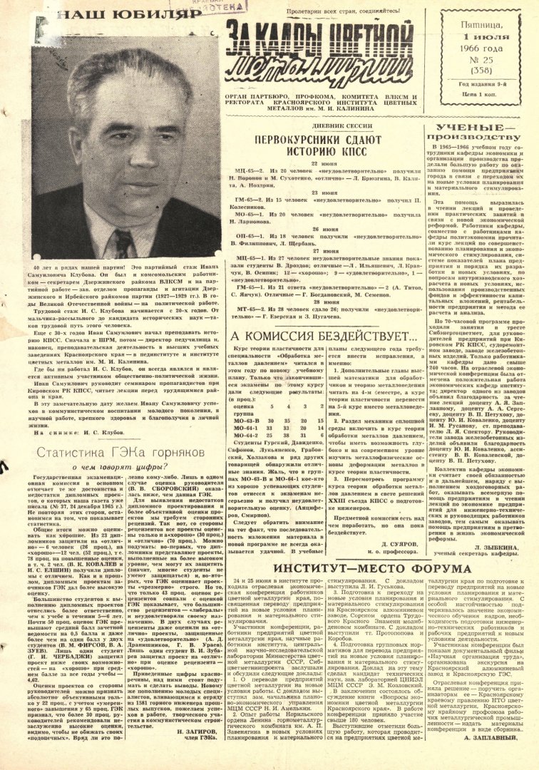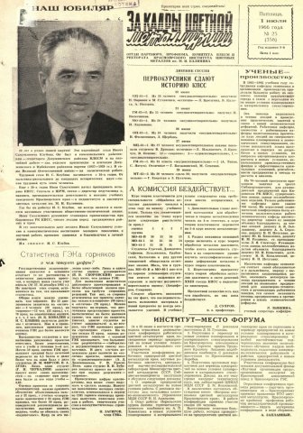 - Институт - место форума : [о работе отраслевой экономической конференции работников цветной металлургии края, посвященной переводу предприятий на новые условия планирования и материального стимулирования (24-25 июня 1966 г.)]. — С. 1.