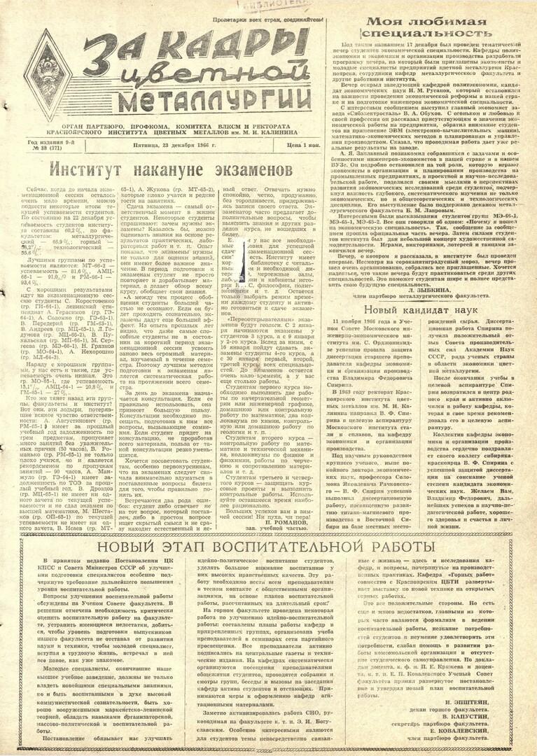 За кадры цветной металлургии : газета. 1966 г. № 38 (371) (23 декабря)выпуск журнала/газеты