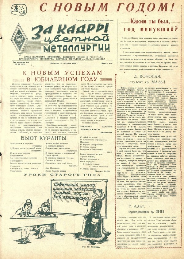 - Каким ты был, год минувший? : [на вопрос ответили: студенты Д. Конопля (гр. МЛ-66-1) и Г. Альт (гр. ОП-61-В), мл. научный сотрудник В. Ковалев (фото), председатель спортклуба В. И. Зайцев, баскетболистки сборной команды института, чемпион края В. Саблин]. — С. 1,2.