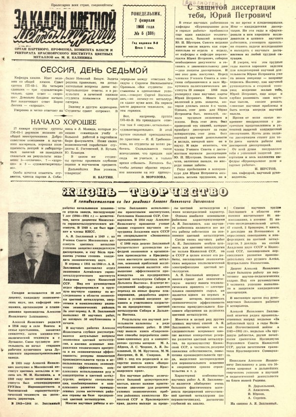 За кадры цветной металлургии : газета. 1966 г. № 5 (338) (7 февраля)выпуск журнала/газеты