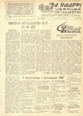 - Цветная металлургия СССР за 50 лет : [сокращенный доклад зав. кафедрой экономики. Окончание. Начало в № 17 за 26 мая 1967 г.]. — С. 1.
