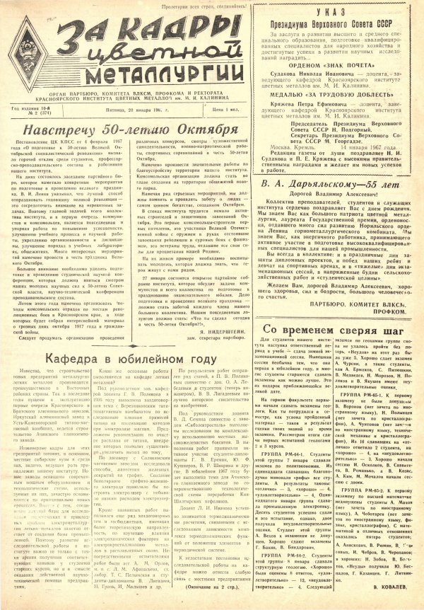 - [Награждение работников высшей школы - Судакова Н. И., Кряжева П. Е.] : [Указ Президиума Верховного Совета СССР от 14.01.1967]. — С. 1.