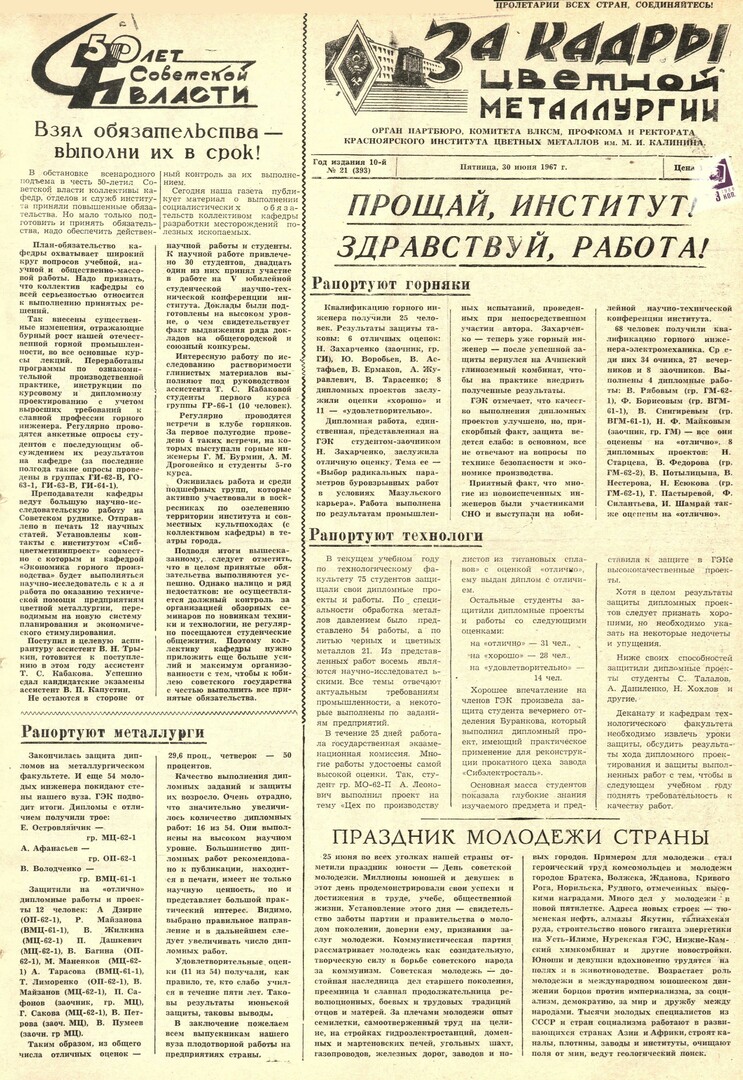 - Прощай, Институт! Здравствуй работа! Рапортуют металлурги : [результаты защиты дипломных проектов]. — С. 1.