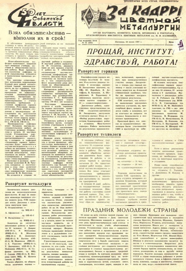 - Прощай, Институт! Здравствуй работа! Рапортуют горняки : [результаты защиты дипломных проектов]. — С. 1.