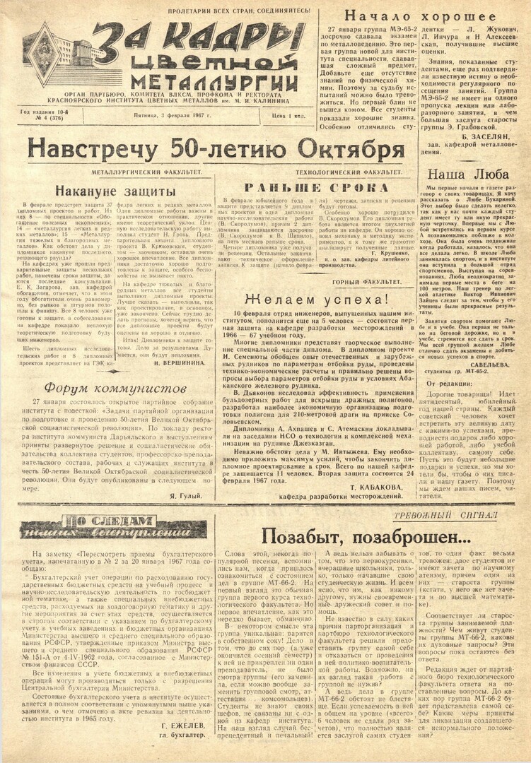 - Желаем успеха! : [первая защита на кафедре разработки месторождений в 1966 - 67 учебном году (10 февраля)]. — С. 1.