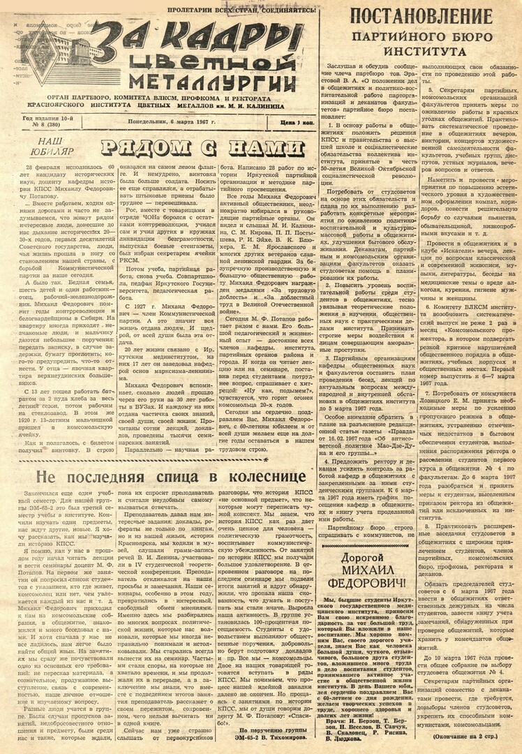 - Не последняя спица в колеснице : [о преподавателе истории КПСС - Потапове М. Ф.]. — С. 1.