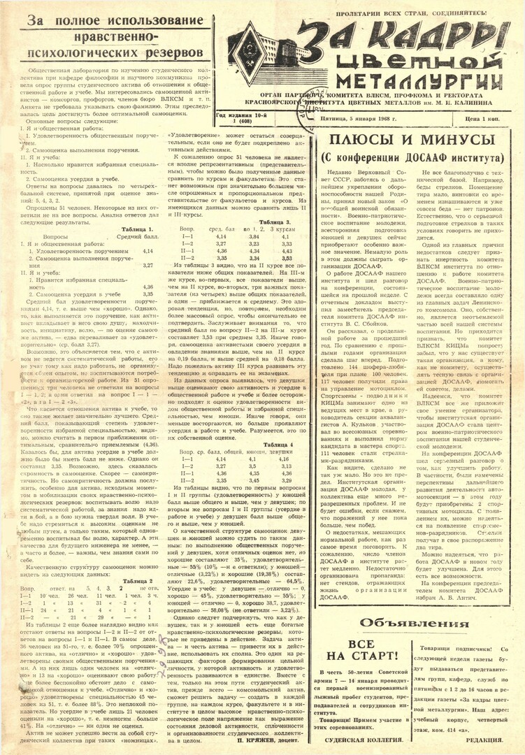 За кадры цветной металлургии : газета. 1968 г. № 1 (408) (5 января)выпуск журнала/газеты