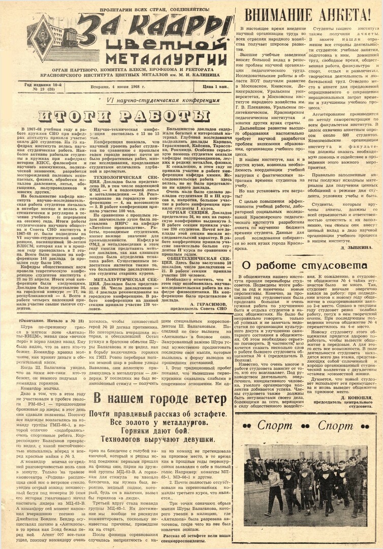 За кадры цветной металлургии : газета. 1968 г. № 19 (20) (4 июня)выпуск журнала/газеты
