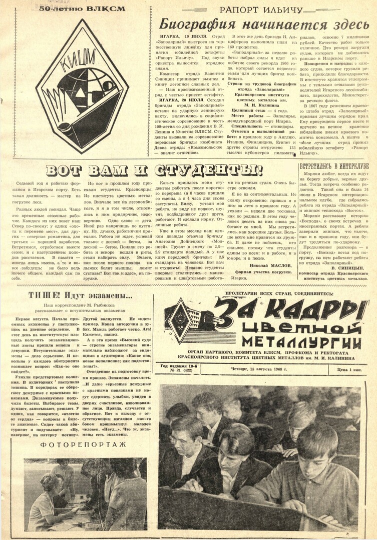 - 50-летию ВЛКСМ : [рисунок: эмблема КИЦМ]. — С. 1.