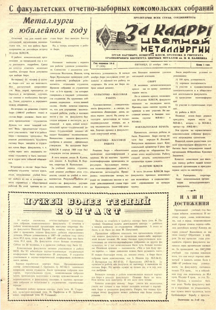 - Металлурги в юбилейном году : [отчет о работе комсомольской организации металлургического факультета за прошедший год]. — С. 1.