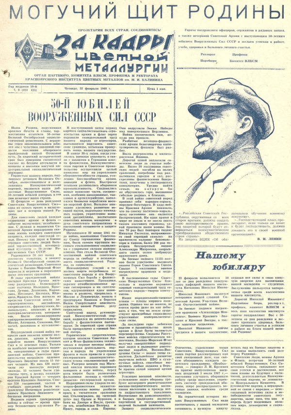 - [Поздравление] : [с 50-летним юбилеем Вооруженных Сил СССР от ректората, профкома, парткома, комитета ВЛКСМ]. — С. 1.
