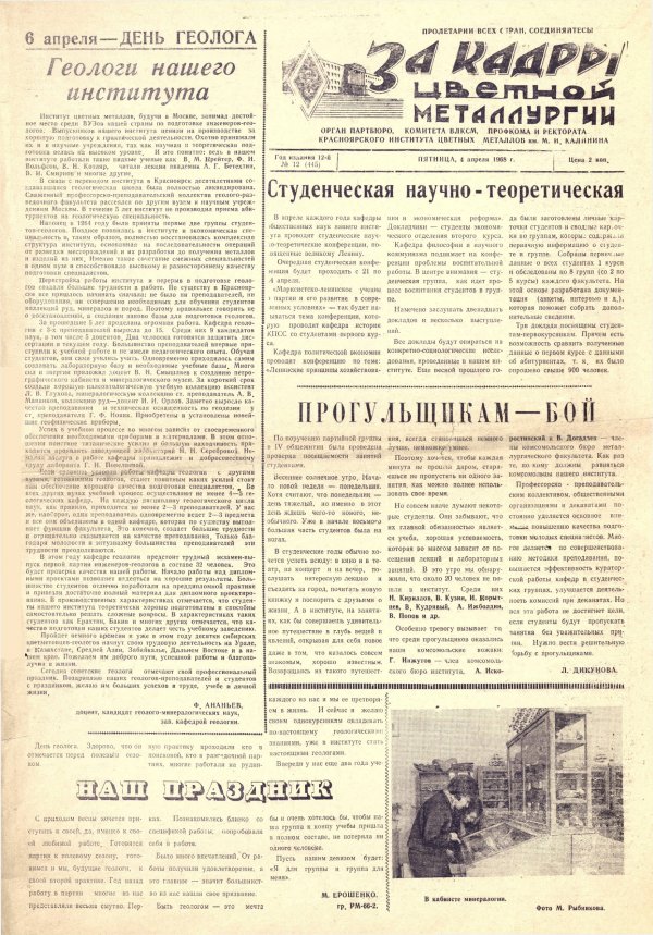 За кадры цветной металлургии : газета. 1969 г. № 12 (445) (4 апреля)выпуск журнала/газеты