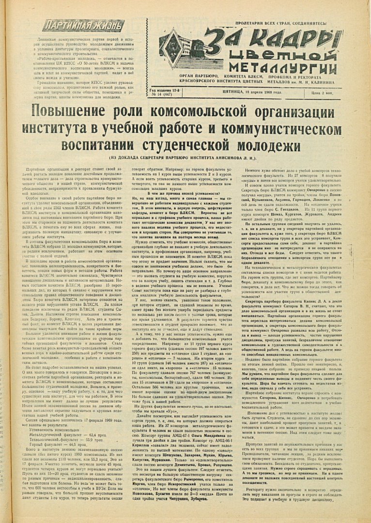 - Повышение роли комсомольской организации института в учебной работе и коммунистическом воспитании студенческой молодежи : (из доклада секретаря партбюро института Анисимова Л. И.). — С. 1.
