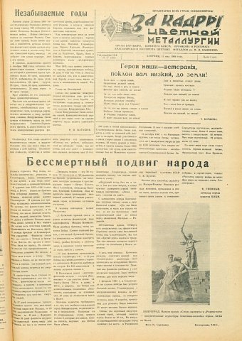 За кадры цветной металлургии : газета. 1969 г. № 17 (450) (13 мая)выпуск журнала/газеты