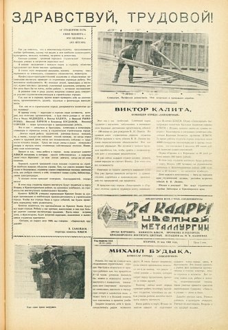 За кадры цветной металлургии : газета. 1969 г. № 19 (452) (20 мая)выпуск журнала/газеты