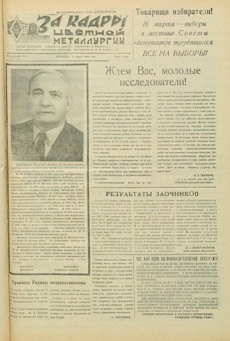 За кадры цветной металлургии : газета. 1969 г. № 9 (442) (14 марта)выпуск журнала/газеты
