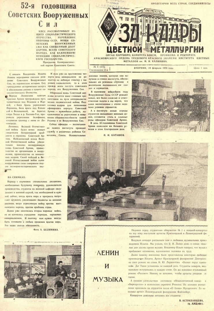 За кадры цветной металлургии : газета. 1970 г. № 5 (475) (24 февраля)выпуск журнала/газеты