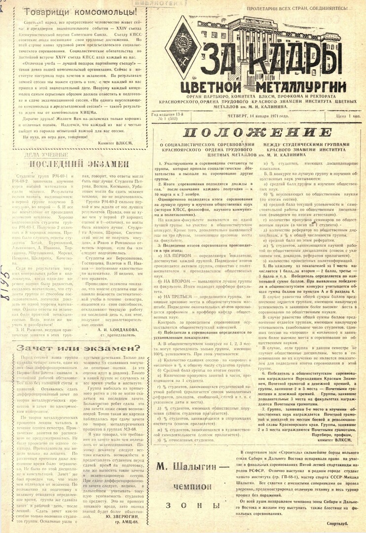 - Положение о социалистическом соревновании между студенческими группами КИЦМа. — С. 1.