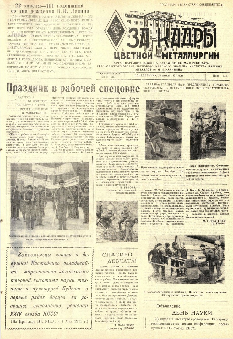 - 22 апреля - 101 годовщина со дня рождения Ленина : [торжественное шествие и митинг преподавателей, сотрудников и студентов института]. — С. 1.