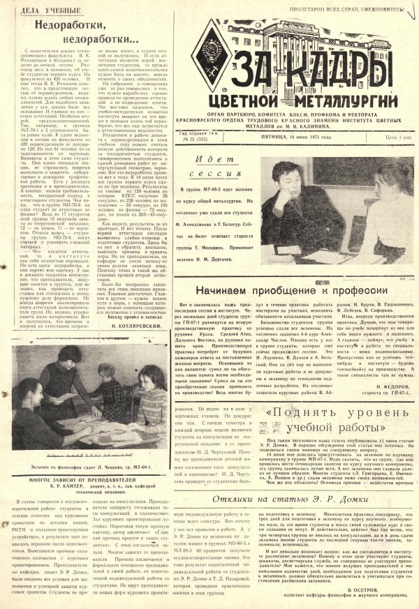 За кадры цветной металлургии : газета. 1971 г. № 22 (522) (18 июня)выпуск журнала/газеты