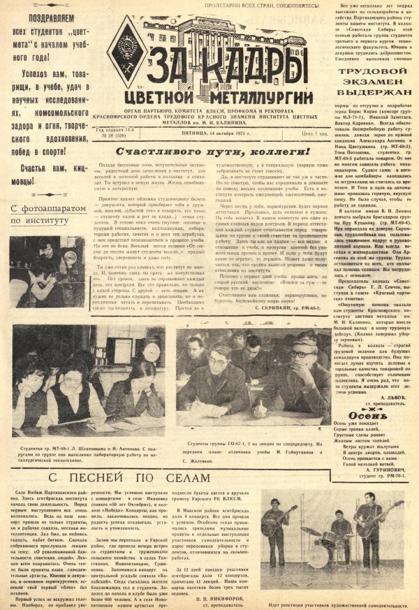 - Счастливого пути, коллеги! : [напутствие первокурсникам от студента гр. РМ-68-2]. — С. 1.