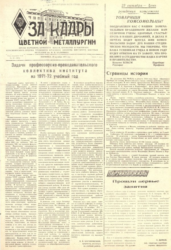 - 29 октября - День рождения комсомола : [поздравление комсомольцев института от комитета ВЛКСМ, ректората, партбюро, профкома]. — С. 1.